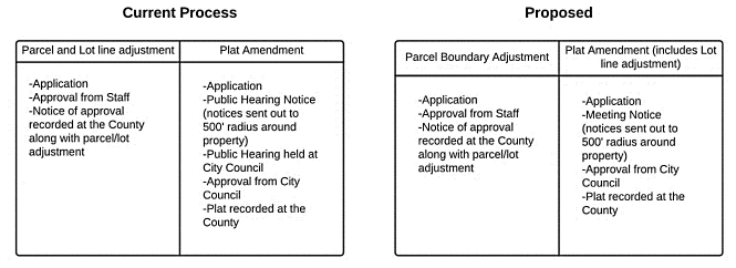 - PUBLIC HEARING/ORDINANCE: TEXT AMENDMENT – PARCEL BOUNDARY ADJUSTMENTS, LOT LINE ADJUSTMENTS, AND PLAT AMENDMENTS Legislative 8:05 (10 minutes)